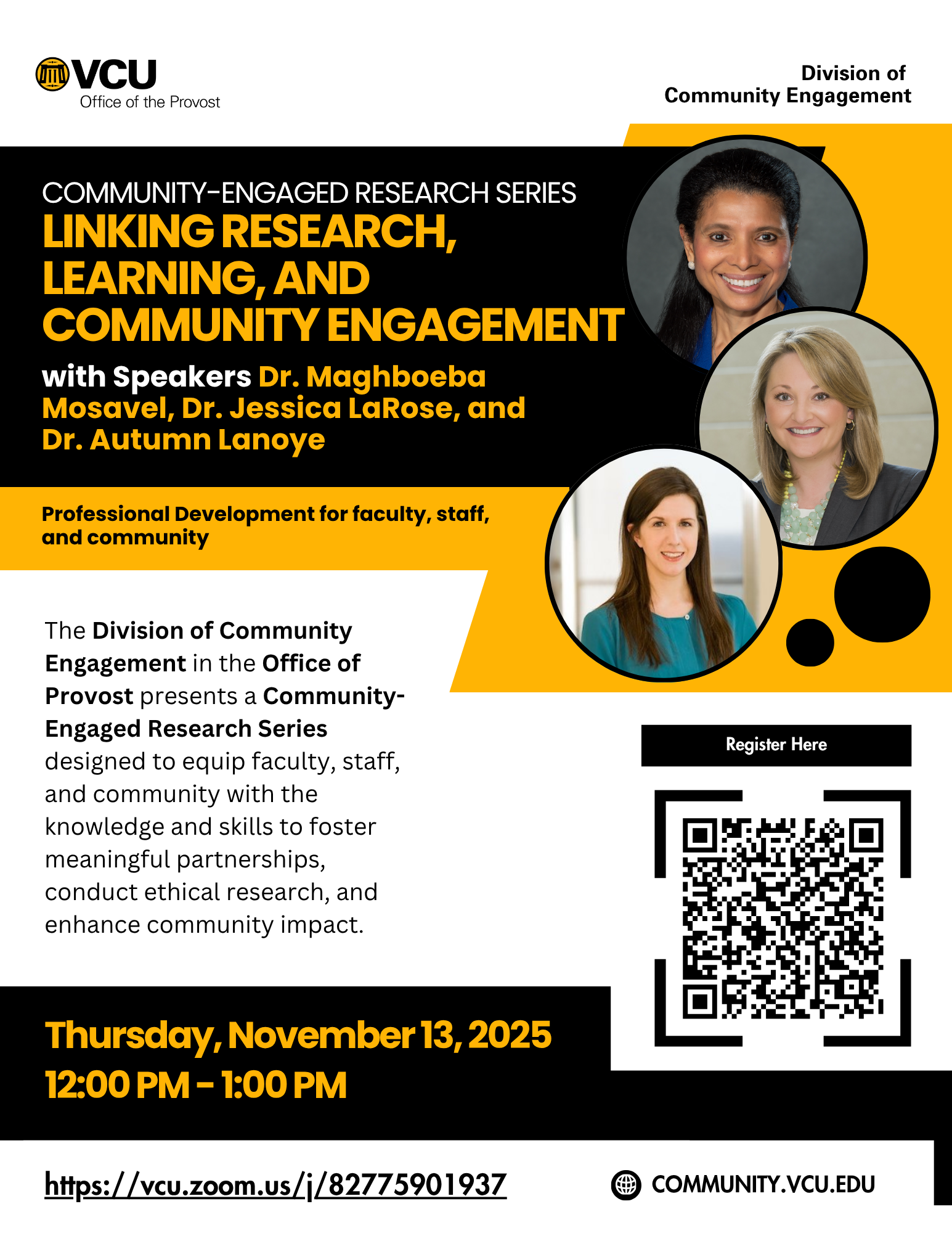 The Division of Community Engagement in the Office of Provost presents a Community-Engaged Research Series designed to equip faculty, staff, and community with the knowledge and skills to foster meaningful partnerships, conduct ethical research, and enhance community impact.